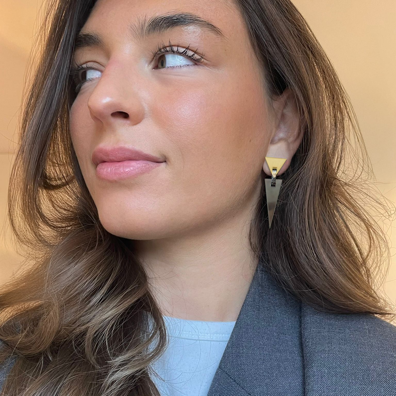Inspirées par le mouvement artistique Memphis des années 80, ces boucles d'oreilles réinterprètent l'audace graphique de cette époque emblématique dans une palette de tons classiques et intemporels.